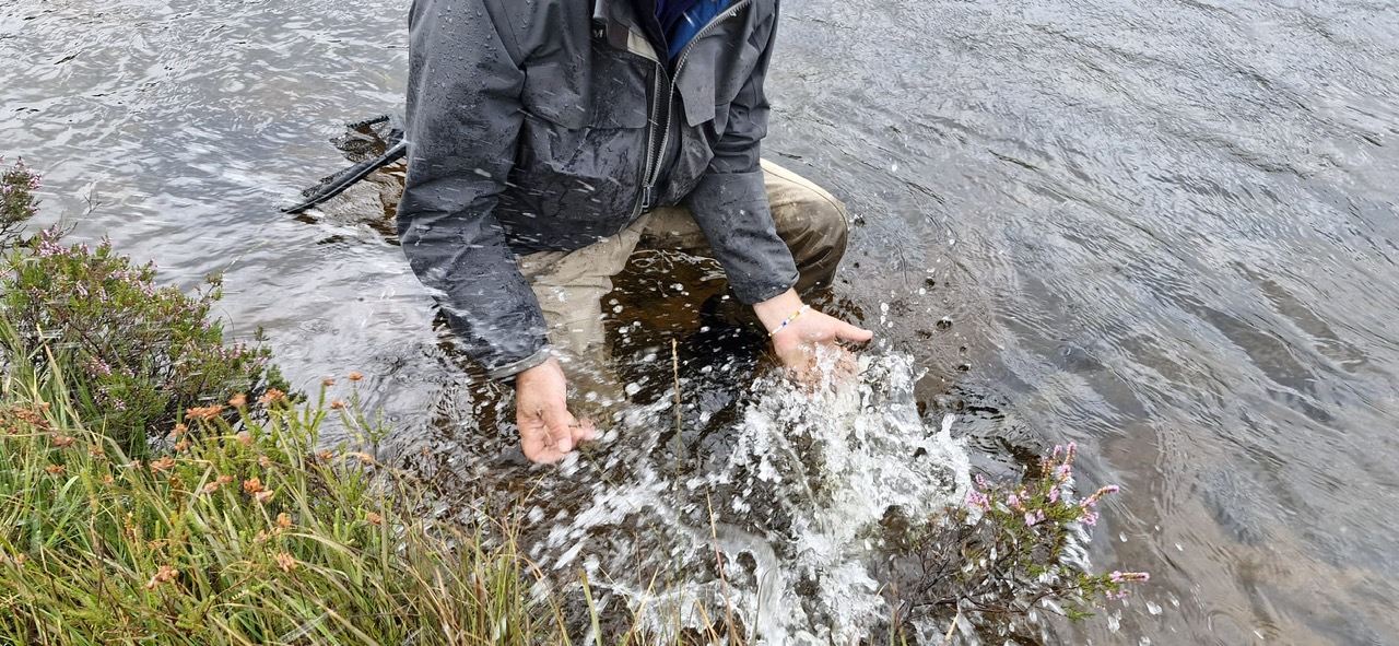 The next morning in Banchory, the evening’s localised thunderstorm has raised the river Dee by five inches. Where the river Feugh enters the main stem, there is a clear demarcation between clear but slightly peat-stained water and the muddy main river. My chance? But within a few hours, everything is back to low water levels, the sun shines bright, and water temperatures rise again. The dog walkers arrive, and everyone wants to throw everything they can find into the water, finally concluding with themselves, both man and beast.