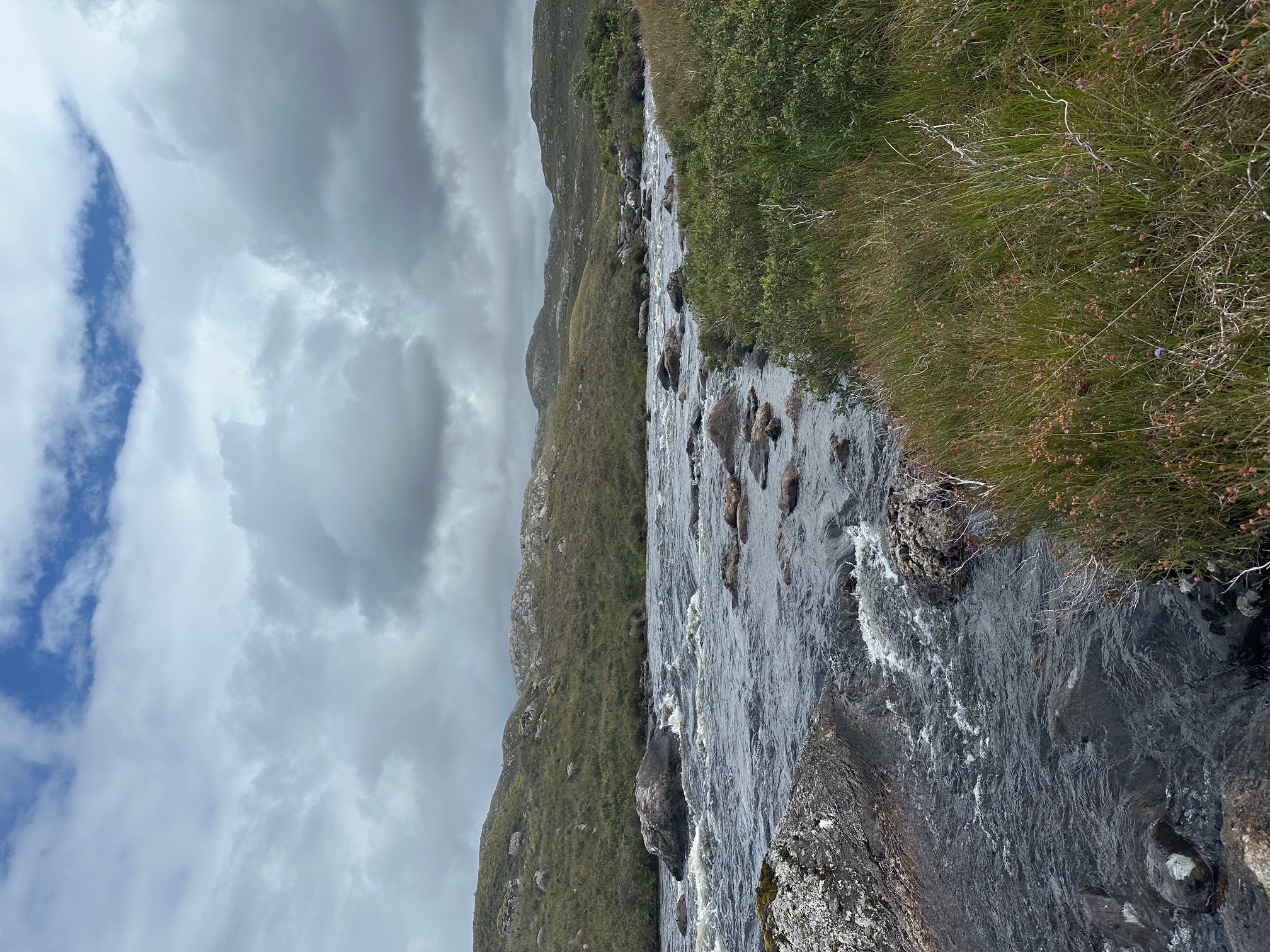 White horses break the bay – the aftermath of Storm Floris, in turn broken by the wing-born plumes of water, shattered by gannets spearing mackerel. In the distance, the Summer Isles bring perspective to the place. After seven hours, I am here at the mouth of a little spate river, where it opens its heart to migratory salmon and sea trout, weary-kneed and drunk with the delight of fast running, fast taking salmon climbing its rocky waters. Not even a goat path to help our descent, we scrambled around and across boulders with just a fly line for company, and happy fish.