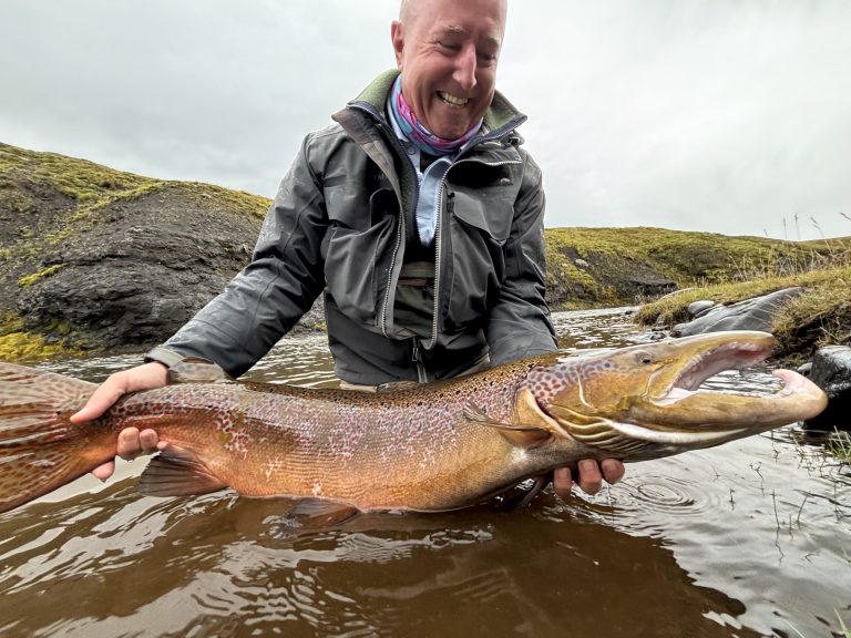 For the technical, fishers he took a collie dog on a single-handed eight-weight Orvis Helios, and took 30 mins to land, before I slipped him safely back into the Laxa Hrutafordur